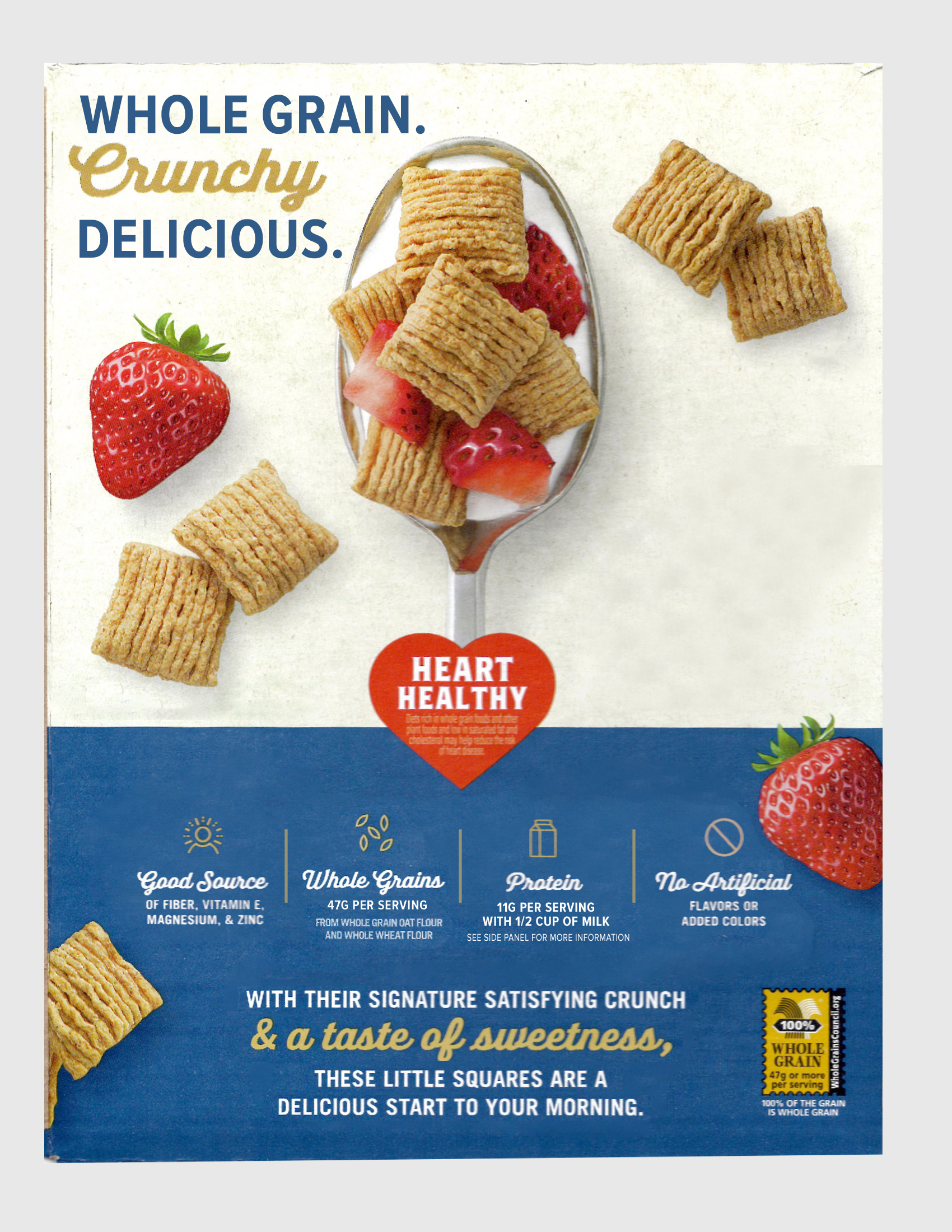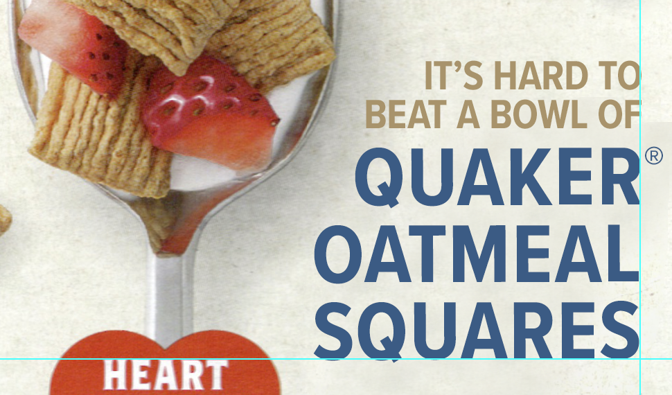 - Quaker Oatmeal Squares (use a sans serif font, right align, use the eye dropper tool to select blue and manually adjust the Registered mark to hang off the right side)
